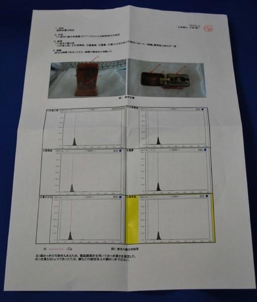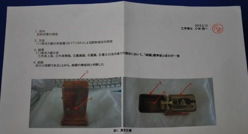 | 備考: | 経年及び流通過程で付いたと思われる、微キズやクスミ等が見られますが未使用品です。(インサイド・ユニット・1958年~59年製・ゴールド仕上げ、銅製品は磨くとキレイになります) ※ ご購入頂いた方には、下記の内容が記載された書面を添付します。 1.目的 試料材質の同定。 2.方法 蛍光X線分析装置 (SII FT110A) による試料成分の同定。 3.結果 外面上面、外面側面、蓋裏縁、蓋裏、着火口元の全ての部位において「純銅」標準板と成分が一致。 4.結論 成分は純銅であることから、純銅の無垢材と判断した。 注)銅めっきの可能性もあるため、電磁膜厚計を用いてめっき厚さを測定した。 めっき厚は「0μm」であったため、銅などの磁性体上の銅めっきではない。 |