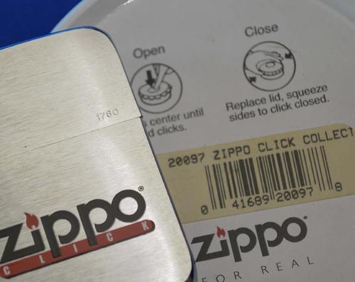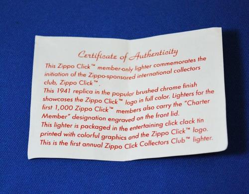 | 備考: | 2002年製、ブラッシュクローム仕上げ、1941レプリカ、未開封シール添付、缶ケース入り・紙スリーブ付。(クリック・クラブ取説付き) ※米国ジッポー社の会員制クラブ(ZIPPO CLICK CLUB)、会員にならないと購入できない希少なジッポーです。 |