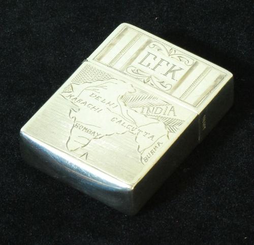 | 詳細: | 銀(SILVER)でボトム・リッドトップ共にブラック・クラッケル特有の船底型のケースを銀細工職人に特注で加工させたライターです、高級将校の持ち物だったのでしょうか? INDIA,,,BURMA-CALCUTTA-DELHI-KARACHI-BOMBAY,,,の都市名が刻印されています。 |