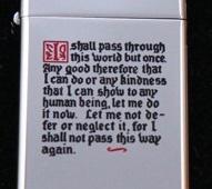 | 詳細: | I Shall pass through this world but once. Any good there fore that I can do or any kindness that I can show to any human being, let me do it now. Let me not defer or neglect it. for I shall not pass this way again. |