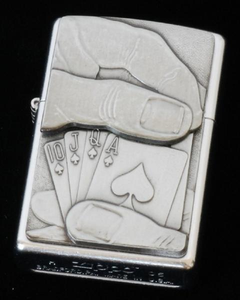 | 詳細: | トランプのポーカーがテーマのトリックライターです。 ふたを閉じているとき、カード4枚(エース、クイーン、ジャック、10)が見えていますが、残りの一枚が分かりません。ふたを開けると、指でつまみあげるようにキングが出てきます。数十万分の一の確率とも言われる超ラッキーなロイヤルフラッシュ! |