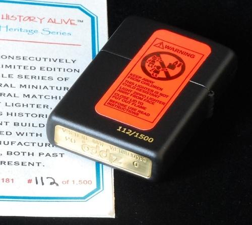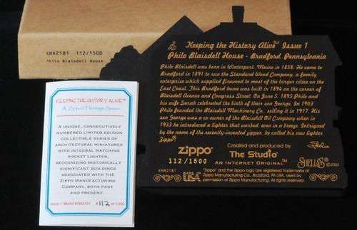 | 詳細: | zippo社とThe Studio社のコラボレーションにより製作された「KEEPING THE HISTORY ALIVE」シリーズ。ジッポーと木製ディスプレイのセットです。1500セットの限定品で、zippo 裏面とディスプレイ裏面に共通のシリアルナンバーが刻印されています。 これは、ZIPPO社創業者のブレイズデル氏の家をモチーフにしています。 |