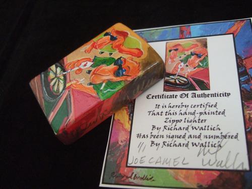 | 詳細: | RICHARD WALLICH:リチャード・ウォリックの手書きジッポーです。彼は、ジッポー社からジッポーのペイントを初めて許可されたイラストレーターです。この独特の色遣いが注目を浴びており、ジッポー社はいち早くこのことに気付いていた様です。 小学校時代に先生のピンク・フォードを描いたことが「画業」の始まり。 アメリカ・アカデミー(シカゴ)在学中の師は、アーヴィング・シャピーロとダグラス・グレイプ。ここ数年はNFL,MLB,ケンタッキー・ダービー、R.J.レイノルズ、アメリカン・エアラインなどビック・プロジェクトで腕を振るった。 マイアミのスーパー・ボールの壁画からネクタイまで、アートの対象も多彩でユニーク。 ZIPPOの小さなボディでさえキャンパスとしました。 |