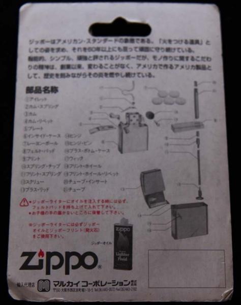 | 詳細: | アウトドアで本領発揮する、ウィンドプルーフのジッポーライター。 パッケージ裏には、部品名称等細かく記載されています。 |