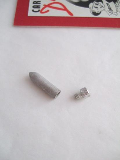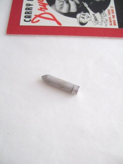 | 詳細: | ワールドフォトプレス社の「ZIPPO MANUAL 6 ジッポーマガジン」の75ページに掲載されている、フリントケースと「ほぼ同型」のフリントケースの様です。(予備フリントを2個収納できます) カナダ・ジッポーのオイル止めには、中央に大きな穴が開いていて「フリントケース」の先端のロケットの様な尖った部分からオイル止めのフェルトの穴に入れて使用できます。 この商品は、アメリカの著名な「ライター・コレクター」から入手したもので、画像で見る「販売用台紙」は、1930年代に実際に販売使用された台紙を「サイズを小さく」復元したもので、オリジナルは「ジッポーのウイックボード」より少し小さめで、この「フリントケース」が20~30個台紙に貼り付けて販売していたそうです。 画像を見ると、ジッポー以外の「ライター」に使用しているのが分かります。また、ブラッククラックル(WW2)のインサートの中に忍ばせて使用していた事も「確認」されています。 カナダジッポー(1949年・販売開始)をより、以前に「10¢」で販売されていた「フリントケース」の存在が、カナダ・ジッポーの「オイル止めフェルト」の穴を大きくしたのでは???と思うと、興味深い逸品です。 |