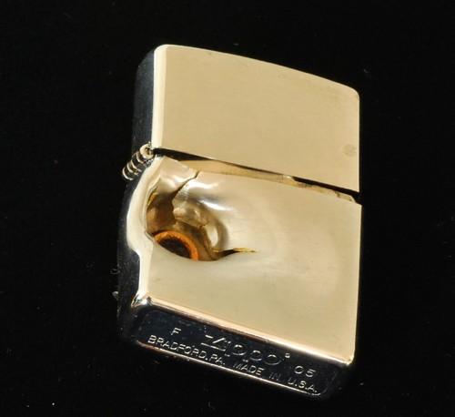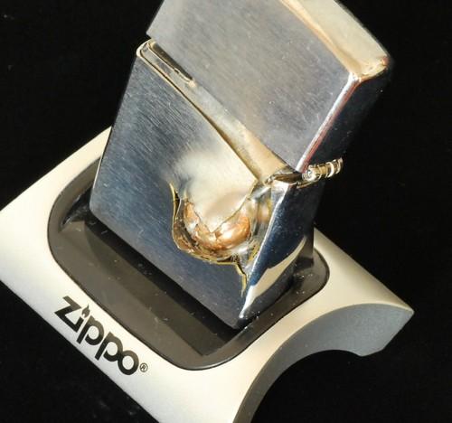 | 備考: | 本品はZippoに拳銃で故意に発射されたものです,当然ながら国内ではこの様なことは違法のため出来ません。本品は、私の師匠のT氏がアメリカのマニアから譲り受けたもので、輸入に際し通関検査を受けた合法品です。実弾が食い込んだ様はリアルで迫力があり「オブジェ」としても、魅力のあるアイテムです。 画像の「スタンド・ホルダー」を、お付けします。 |