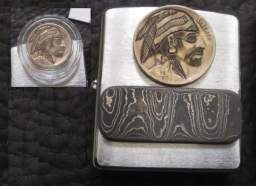 | 備考: | ダマスカスプレート に、1929海賊コインの片面2枚貼りです。 ダマスカスプレートとは:波模様・木目模様が特徴で、強靭な特殊金属ダマスカスは、鉄・鋼・ニッケル等の異金属を重ねて加熱と加圧により、一体化させる工法で「鍛冶屋」の技術の中で最もシビアな技です。地金から自ら作り、本来はナイフとして使われてきたダマスカスの技術を、アクセサリー等に応用した究極のプレートです。 ※このプレートは、ダマスカスプレートのアーチスト、アメリカの「メタルマン」さんの作品です。 |