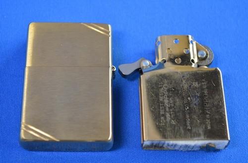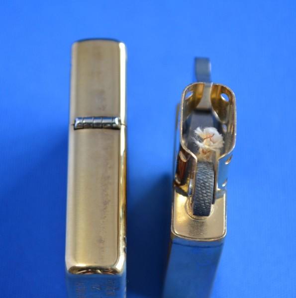 SOLID BRASS 1995年製、未使用品、専用缶入り、保証書付は希少品です。(PAT.2032695 フラットトップ、1937レプリカです) ソリッド・ブラス(SOLID BRASS)とは、ケースの素材である真鍮(Brass)にクロームメッキ等の加工を行わず地色を活かし「金色」に仕上げたモデルです。 |