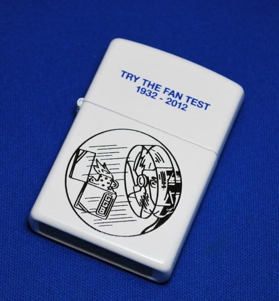 | 詳細: | ファン・テストに挑め!!揺るぎなき、耐風性への自信 耐風ライター、、、言うまでもなく、Zippo の誕生当初から宿命づけられた、明確かつ大胆なコンセプトである。その優れた特徴をアピールするため、創業者のジョージ・G・ブレイズデルは"ファン・テスト”というシンボリックな手法を採用した。つまり扇風機の風をZippo に当て、その耐風性を一目瞭然に知らしめるのである。以来、ブレイズデルは生涯に渡り、オフィスへの訪問者の前に自らファン・テストを繰り返し、扇風機の風ではZippo の炎が消えないことをデモンストレーションして見せている。(コメントはジッポーコレクション第7号より転載させて頂きました) |