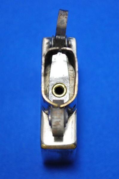 | 詳細: | ケースはブラス製、4バレルヒンジ・コの字型カムクリップ、ダイアゴナルライン入り・ラウンドコーナー。(ヒンジ緩み有り) インサートは、14穴チムニー、、ダルマカム、水平歯フリントホイール、ブラス管からの一体成形(継ぎ目なし)、インサート刻印なし(クロームメッキ仕上げ)、波状リーフスプリング(板バネ)破損、その他パーツは現行品。 リーフスプリング(板バネ)が破損している為、現行品の板バネに交換しました。(画像6.7参照) しかし、カムテンションがイマイチ弱いので、ご購入の方には「現行品インサート」をサービスでお付けします。 |