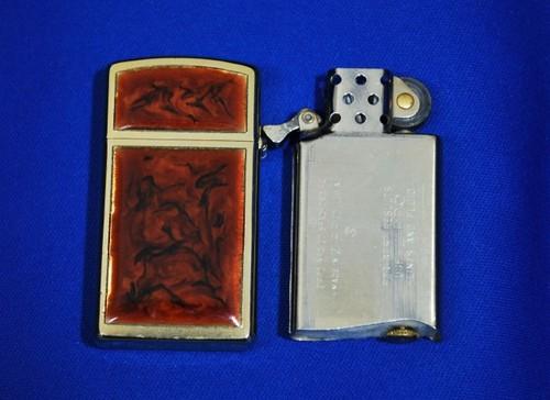 | 詳細: | 金メッキが施されたケースの表面を削って窪みを作り、そこへ複数の色が配されたアクリル樹脂を流し入れて混ぜあわせる。こうすることで、鼈甲に近い見た目と質感を実現するとともに、同じ文様が二つとない、唯一無二のライターが誕生する。中央のパネルには、オーナーのイニシャルを刻印できるようになっている。(コメントはジッポーコレクション第15号より転載させて頂きました) 販売から2年後、前記の様な手の込んだ手法から、アクリル・パネルをケースに貼り付ける工法に変わり、ウルトラライト・シリーズが生まれるきっかけにもなりました。 |