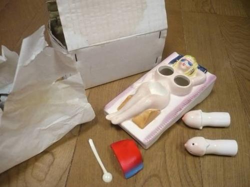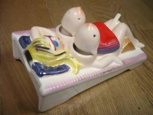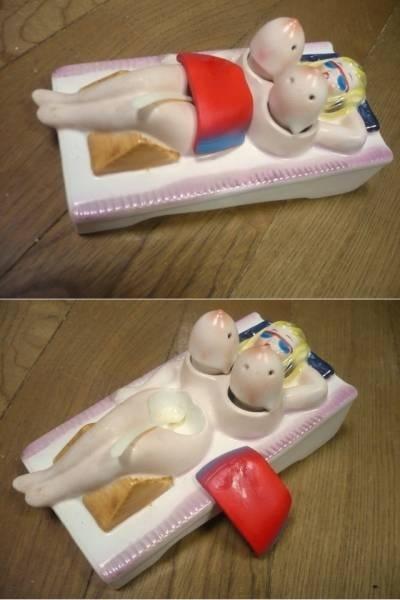 | 詳細: | 1960年代に輸出用に愛知県瀬戸で作られていたデッドストックの「ピンナップ調味料入れ」で胸の部分がソルト&ペッパーで前後にスウィング可動式になっており、下半身部分にも赤いタオルのふたの中が調味料入れになっていて小さいサジが付いています。 サイズは縦14.5cmX横7.6cmX高さ5.5cm(頭部) |