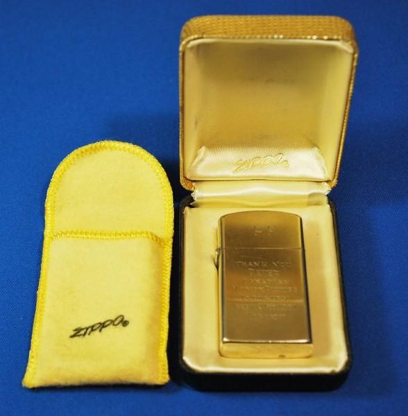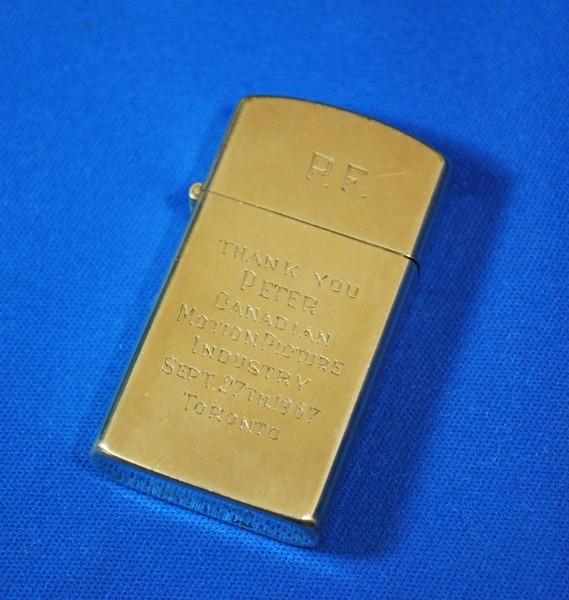 | 備考: | スリムタイプのジッポーは、インサートの刻印から判断して1963~1967年製、10K.G.F(金張り)、ゴールド・メッシュ化粧箱入り・布製ポーチ付きです。(ボトムに1/20刻印あり) 表面上部には手彫りで、ピーター・フォンダのイニシャルP.F.表面下部には下記の様に刻まれています。 THANK YOU PETER CANADIAN MOTION PICTURE INDUSTRY SEPT.27TH.1967 TORONTO |